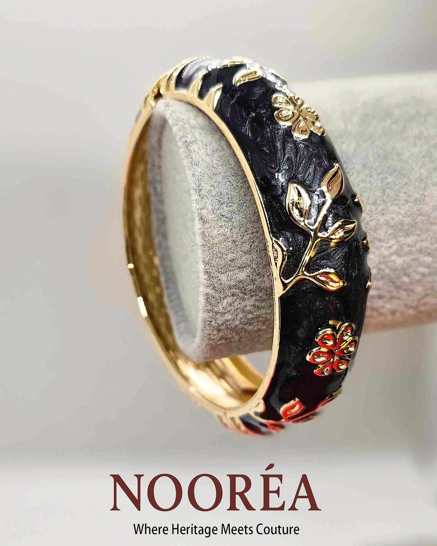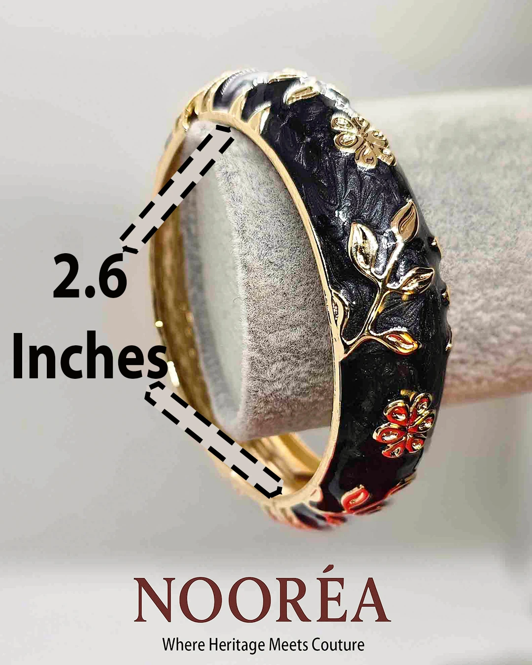 Elegant and expressive, the Noorea Midnight Bloom Heritage Cuff is crafted with deep black enamel and delicate floral motifs that reflect timeless artistry. This 2.6-inch free-size open bangle offers comfort and sophistication, making it ideal for evening wear, festive looks, or statement styling with traditional attire.