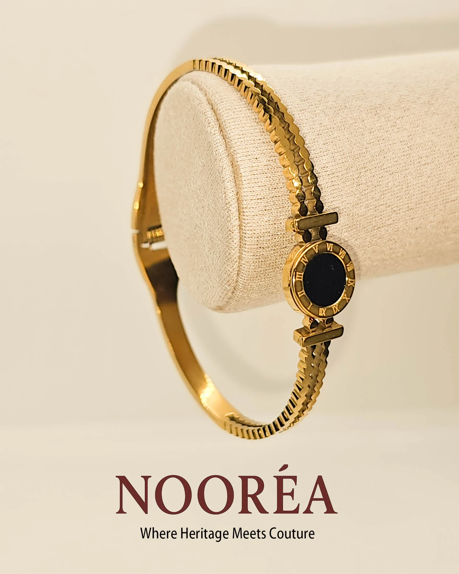 A sleek gold oval bracelet featuring a bold black centerpiece for effortless modern elegance. Elegant 2.4 inch free-size oval bracelet with a convenient side opening for easy wear. Stylish, comfortable, and designed to fit beautifully on your wrist.