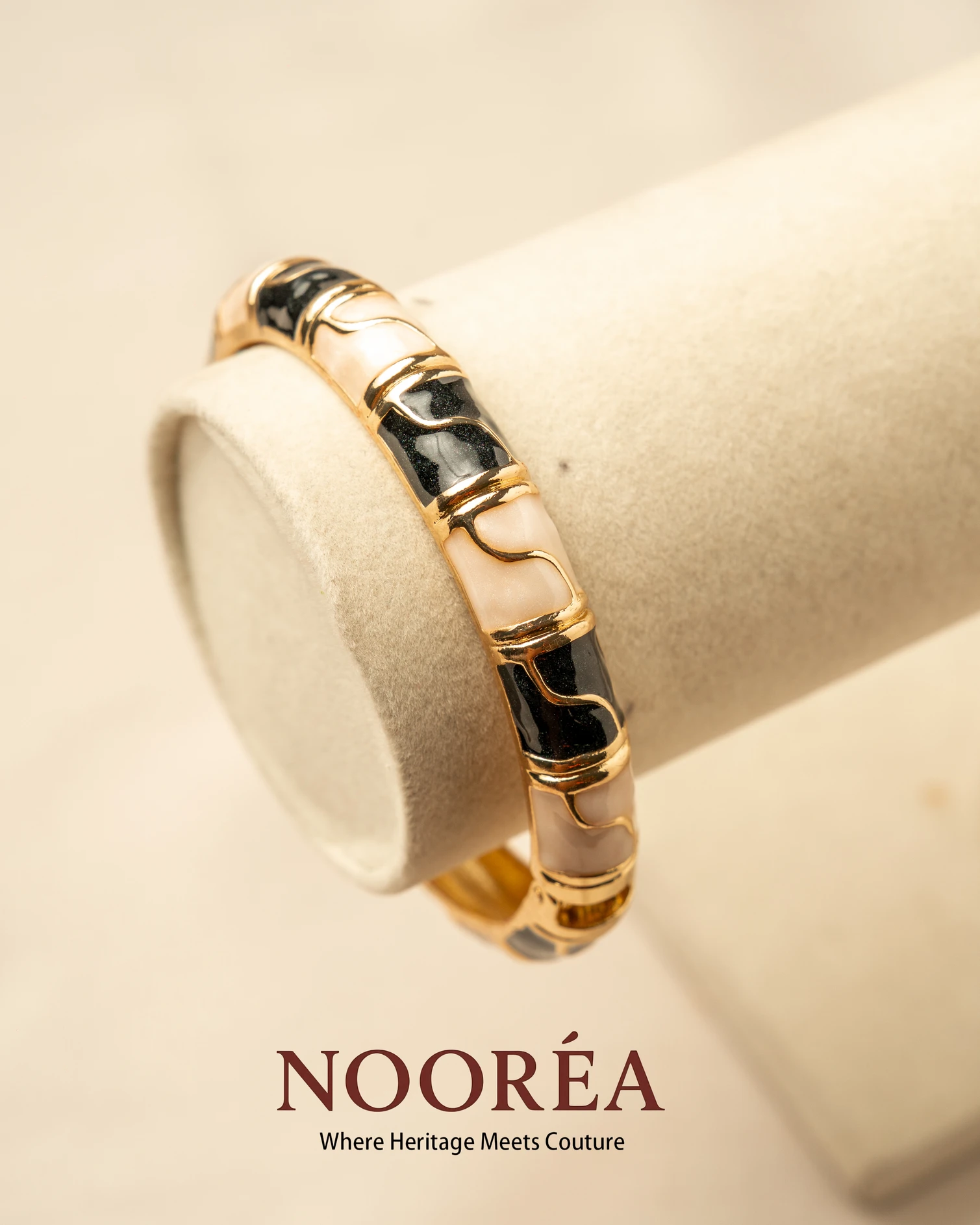 The Noir Petal Gold bangle adds a mysterious charm to your outfit. With petal-like enamel detailing over a golden base, this piece complements both ethnic and Western wear effortlessly.