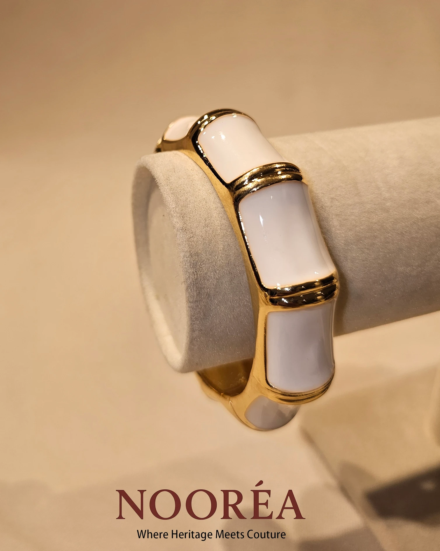 A radiant pearl-white bangle with golden detailing—sophisticated and graceful.