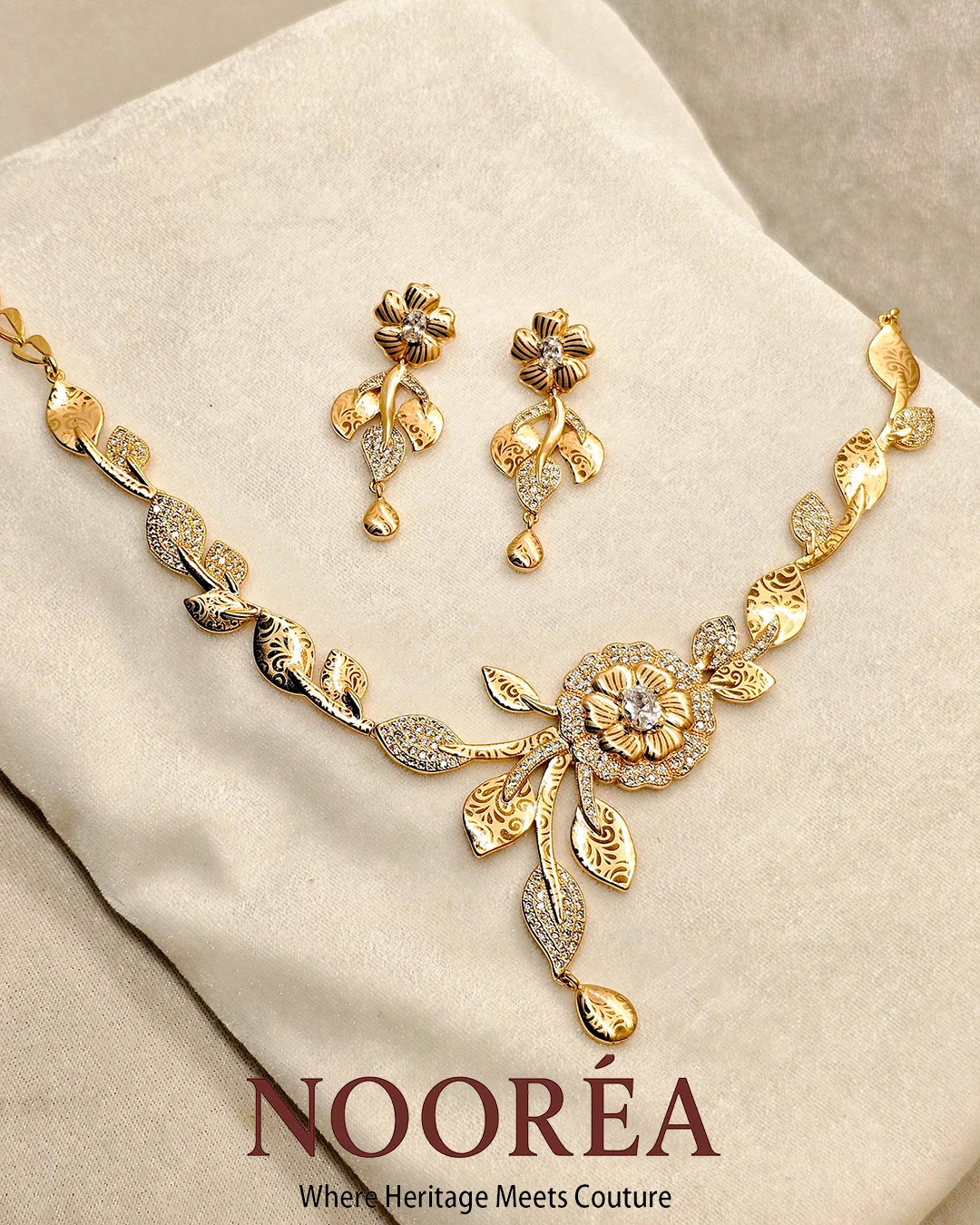 The Pearl Glow Blossom Set features delicate floral shapes enhanced with pearl-style detailing. Its lightweight yet luxurious appearance makes it suitable for daytime events, family gatherings, or Eid celebrations.
