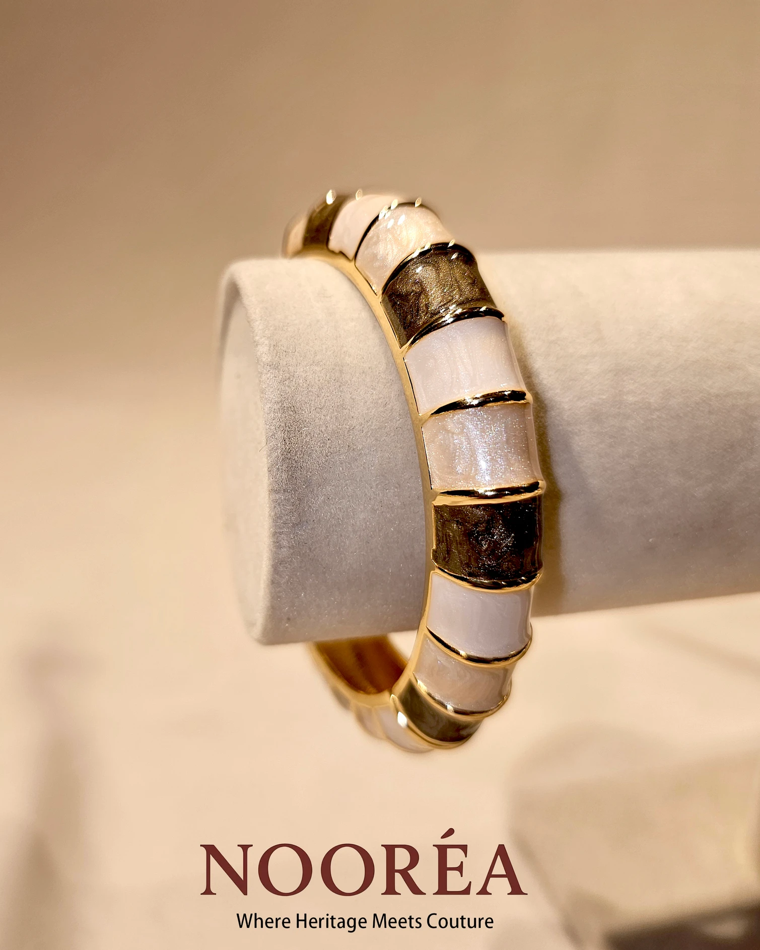 The Pearl Mist Bangle features crisp white enamel contrasted with gold accents, offering a pure and graceful charm, ideal for bridal or festive wear.