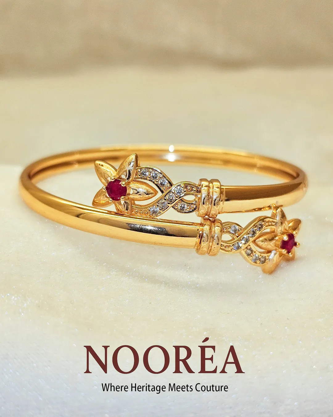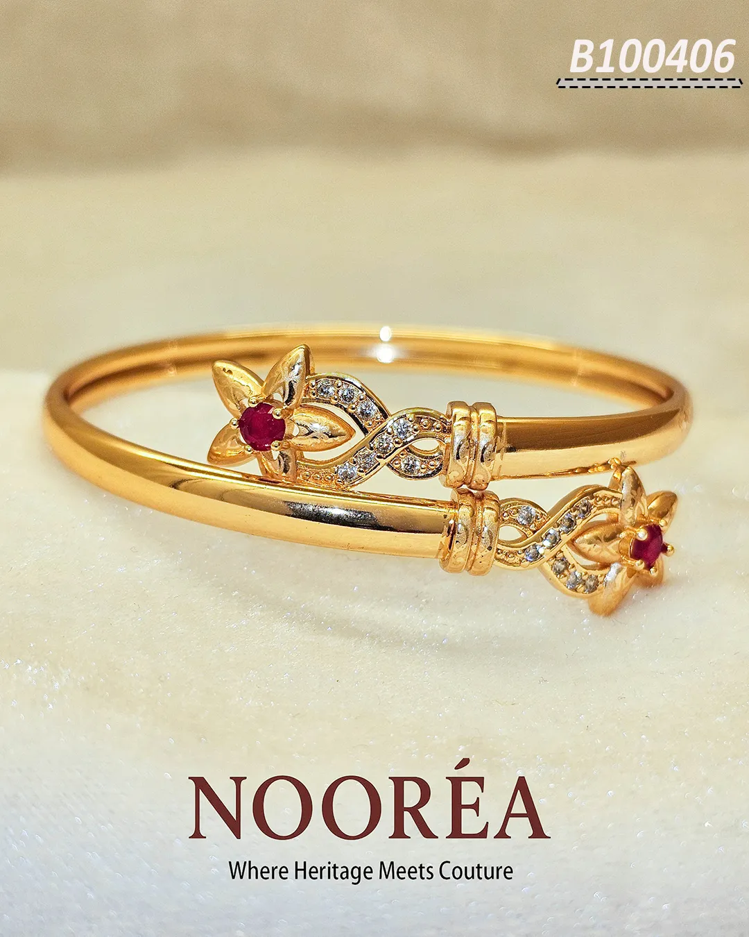 Designed with intricate craftsmanship, the Royal Ruby Crown Bracelet showcases a crown-style motif adorned with shimmering stones and ruby accents. The elegant double-band structure provides a rich and premium appearance, making it ideal for bridal or party wear.