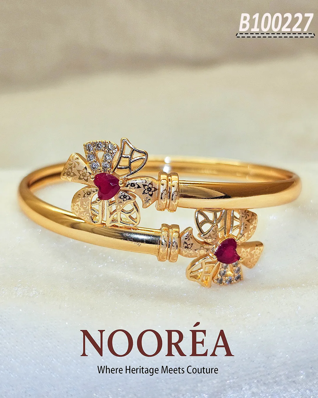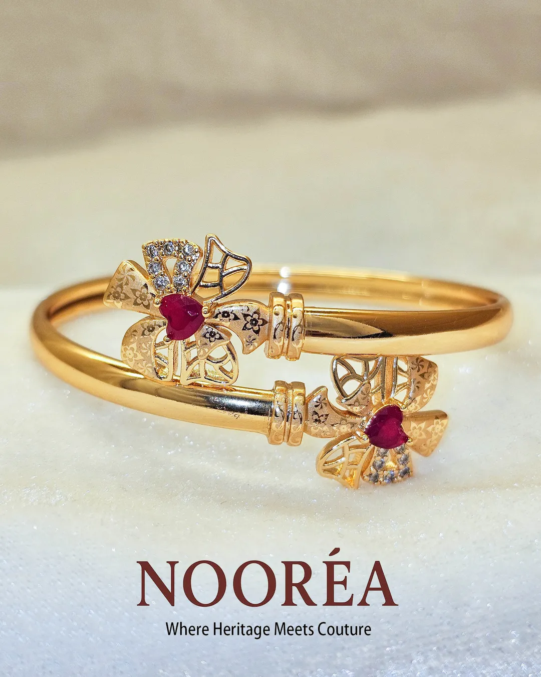 The Ruby Floral Grace Bracelet combines gold polish with sparkling clear stones and deep red accents arranged in a floral pattern. Its slim dual-band structure enhances comfort while adding dimension. Perfect for festive celebrations and traditional attire.