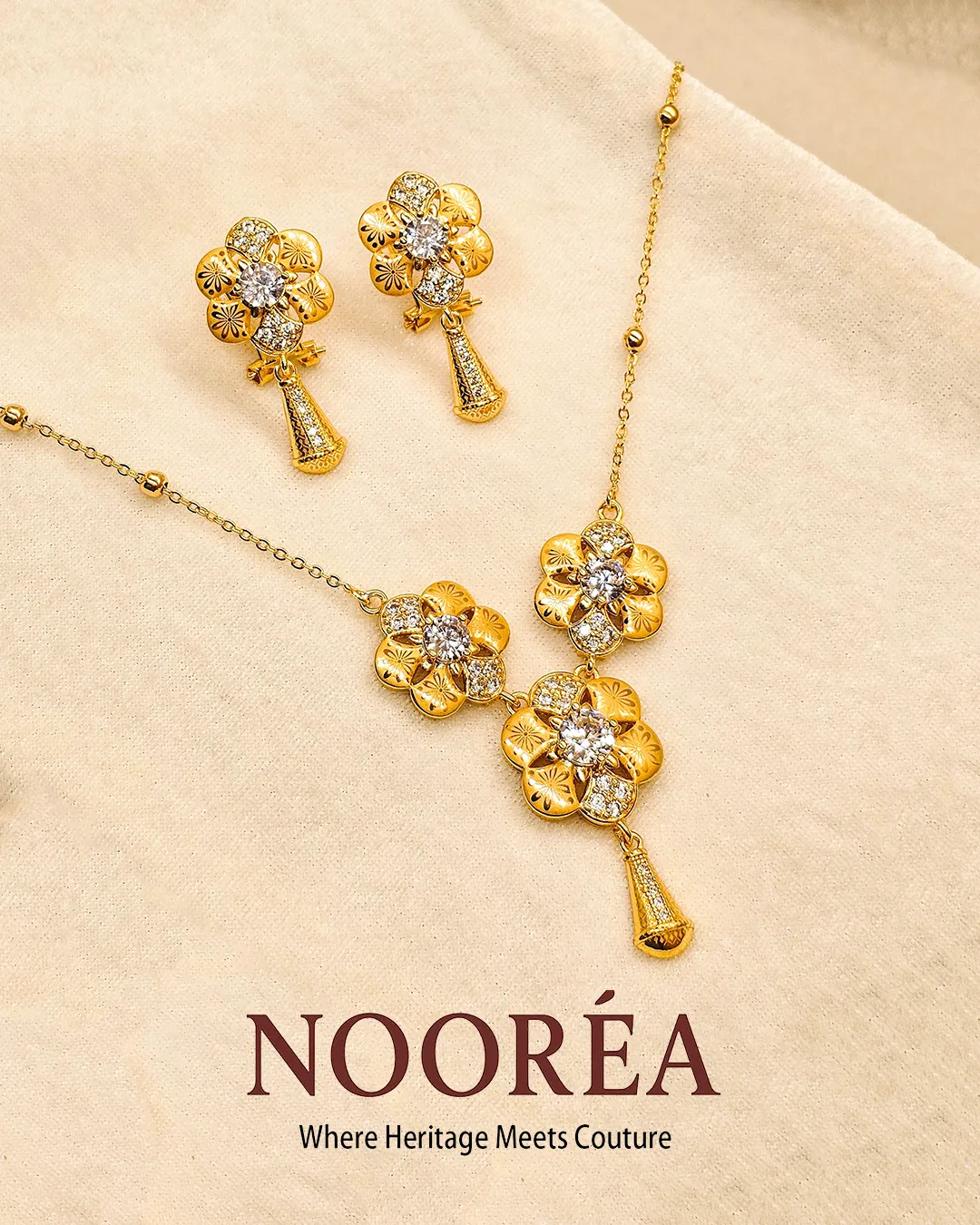 Drawing inspiration from traditional heritage, this set features bold, five-petal golden flowers with intricate engraved detailing. Each bloom is centered with a high-clarity cubic zirconia, flanked by shimmering accents. The necklace and earrings are finished with textured conical drops for a touch of royal flair. The necklace includes an 18-inch chain and a 1-year color guarantee.