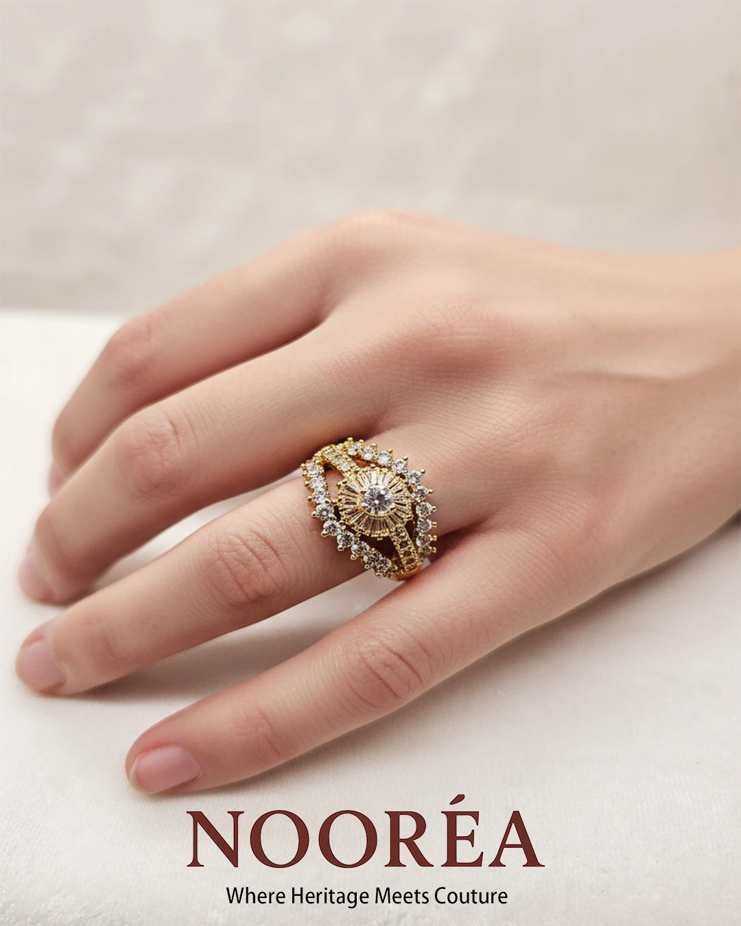 A stunning pear-shaped central stone encased in a double halo of micro-crystals on a textured gold band.
